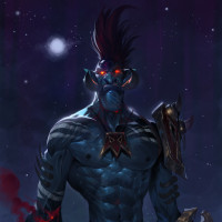 sharp teeth and claws, wearing armor with a helmet that obscures the face. It is holding what appears to be a weapon, possibly a club or mace. The setting suggests a dark, nighttime environment with stars in the sky, which could indicate a scene from a fantasy or