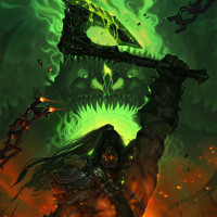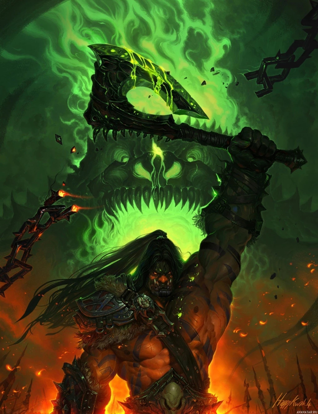 a powerful stance, with the axe held high above its head. The background is filled with dark, ominous tones and fiery elements that suggest