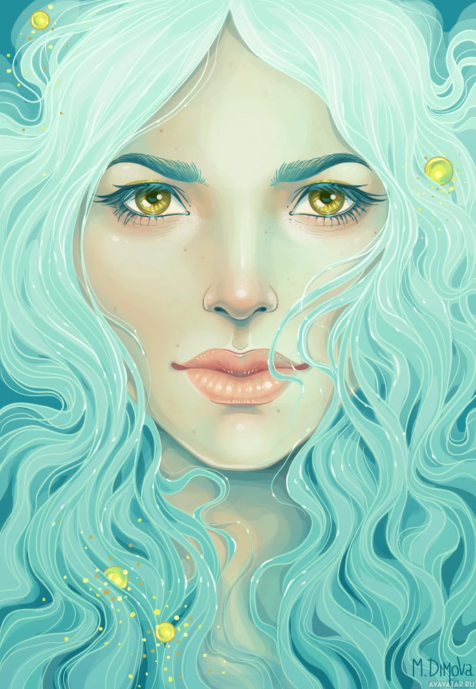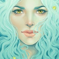a young woman with turquoise hair and striking blue eyes. She has long flowing hair that resembles