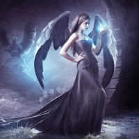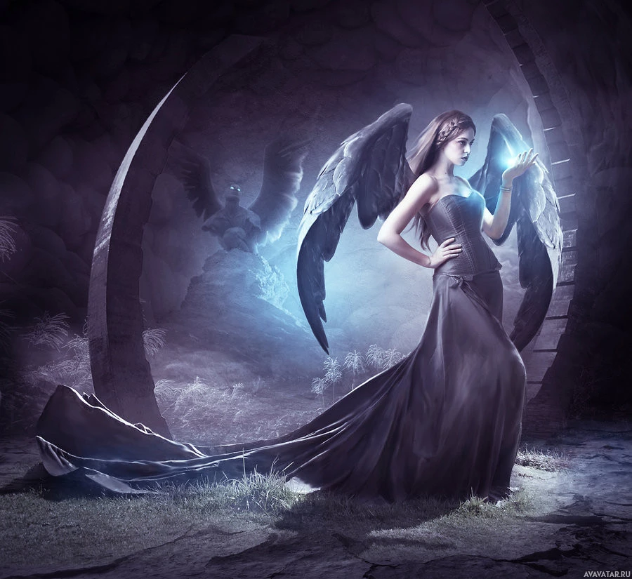 a dramatic effect, highlighting the woman's wings and creating an ethereal glow around her form. There are also two smaller