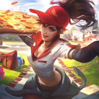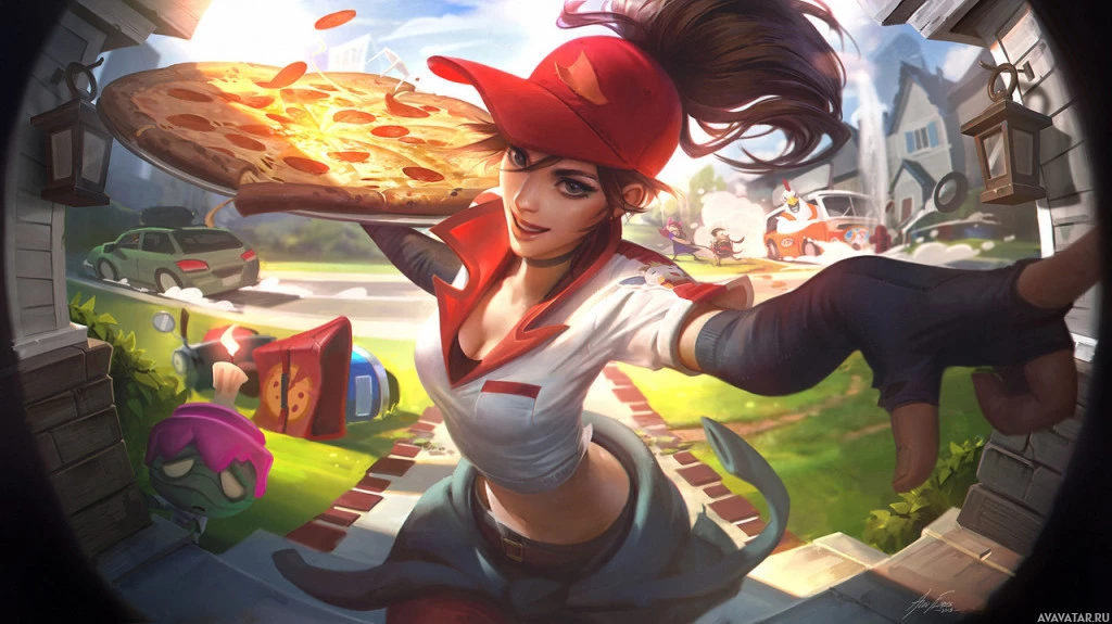 The image depicts a character holding a pizza. This character is styled in an animated, cartoonish manner and appears to be