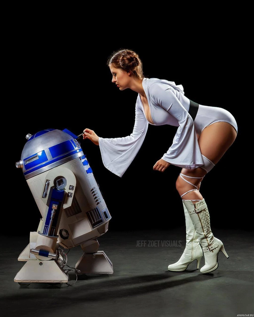 a white dress reminiscent of Princess Leia's iconic outfit and has their hair styled in the classic bun and side braid hairstyle associated with Leia. They appear to be kneeling next to R2-D2, possibly simulating an action or conversation from