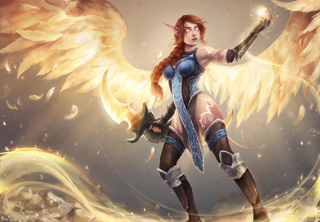 На картинке изображен фантастический персонаж с рыжими волосами. Она изображена как ангельская фигура, часто ассоциируемая с небесными существами или мифическими существами в жанрах фэнтези. Она имеет крылья и держит посох, которые являются типичными атрибутами ангела в фэнтезийном искусстве.