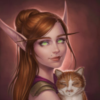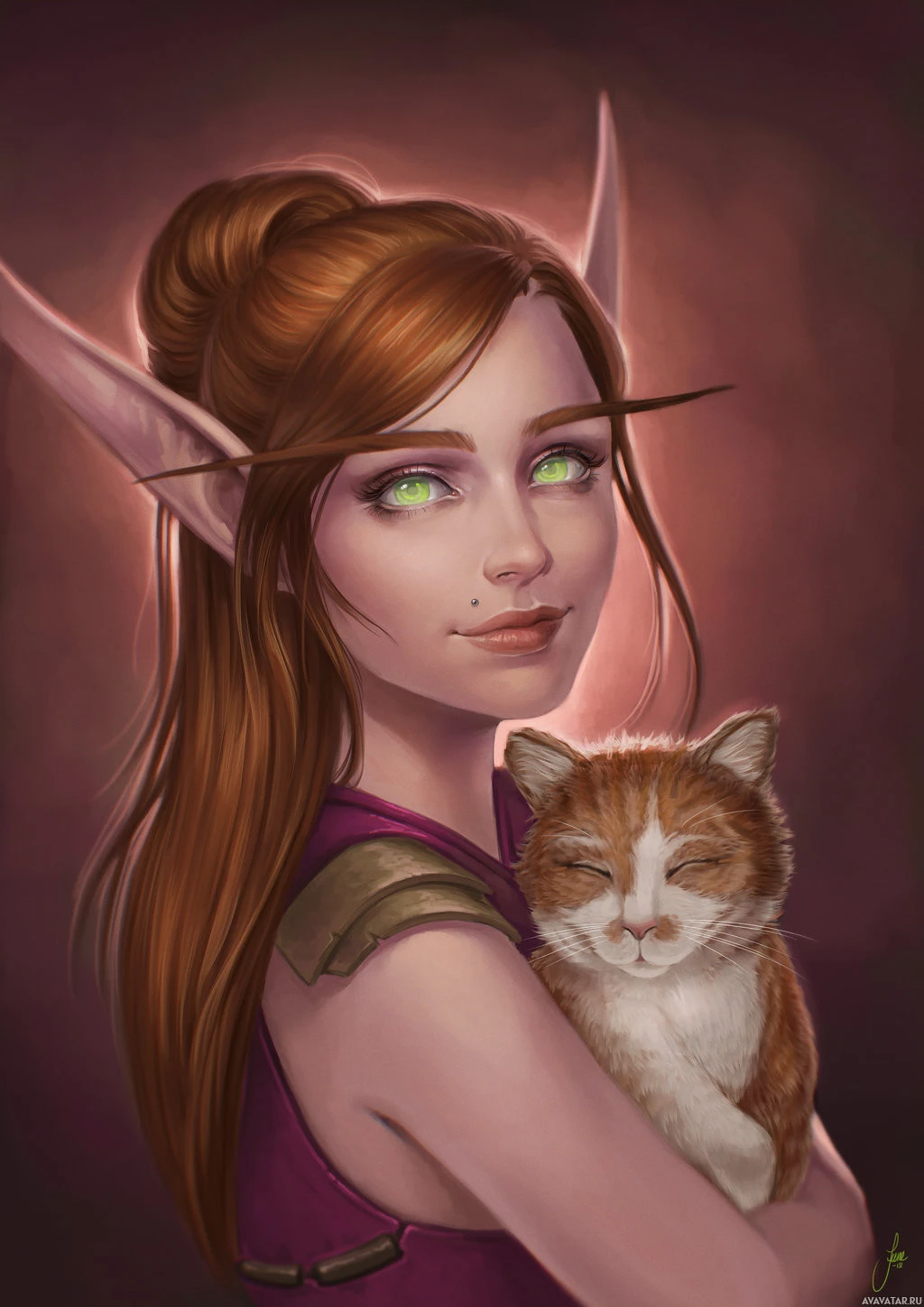 red hair, pointed ears, and is holding a cat. She is wearing
