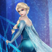 blue steps and walls that are adorned with icicles. Elsa is wearing her iconic ice-