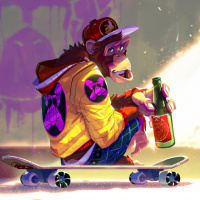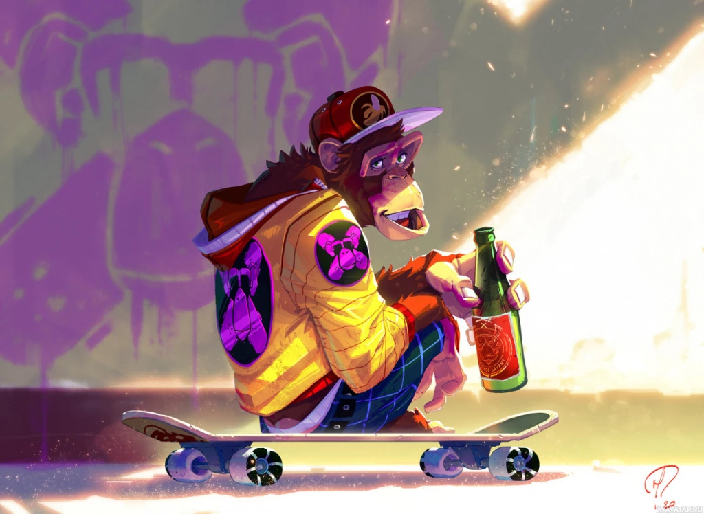 monkey character. The monkey appears to be engaged in skateboarding as it's sitting on a skateboard with its hands resting on its knees. It has a casual appearance, wearing