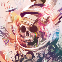 The image is an illustration featuring a variety of elements. At the center, there's a skull wearing a spacesuit with the helmet up, suggesting an astronaut or cosmonaut theme. Around this central figure are various fantastical and colorful elements, such as floating