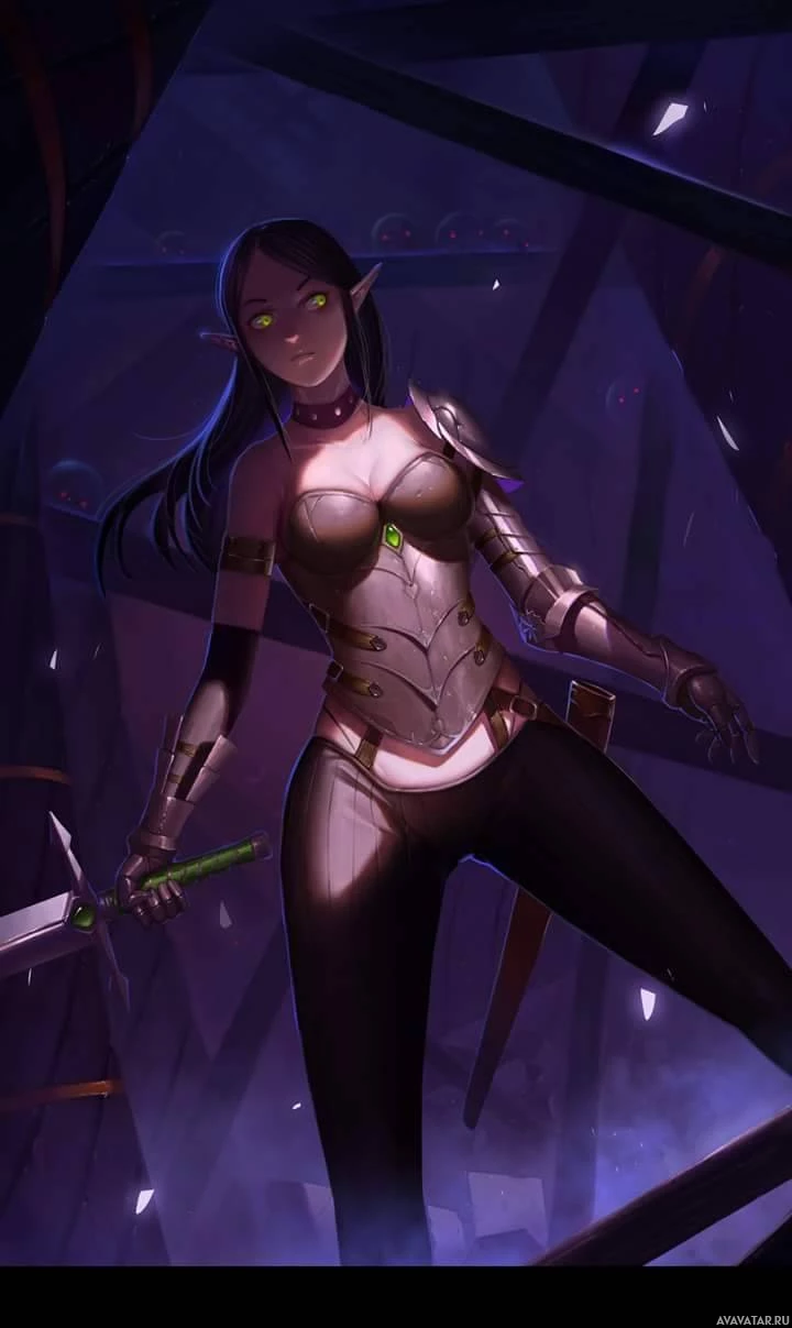 dark hair, pointed ears, and striking green eyes. The elf is dressed in armor that appears to be a blend of metal and leather, suggesting she might be from