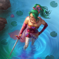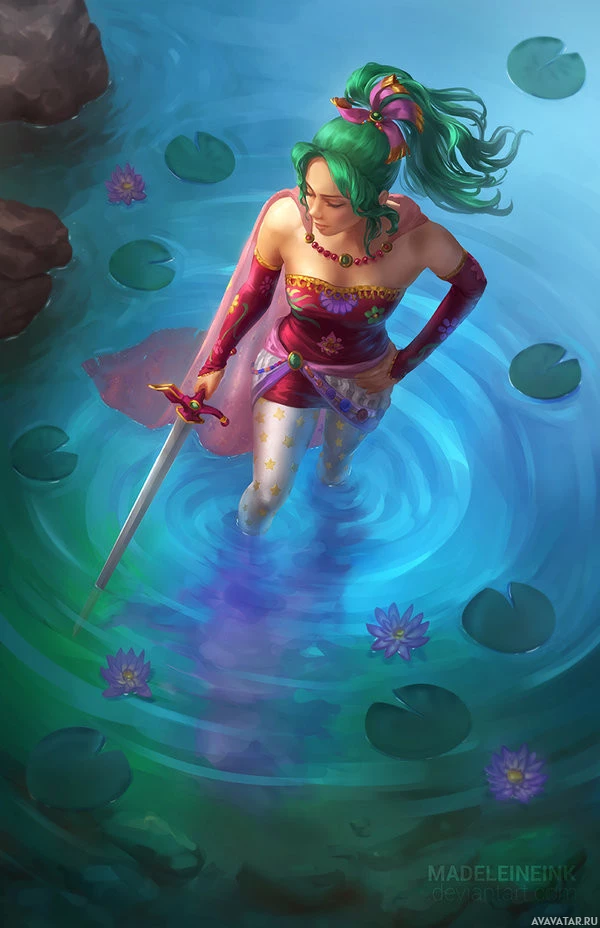 В образе присутствует женский персонаж с зелеными волосами, стилизованными длинными волнами. Она держит меч в правой руке и носит красное платье с белыми сапогами. Обстановка, по-видимому, представляет собой водоем, возможно, пруд или озеро, о чем свидетельствуют плавающие подушечки лилии. Общий тон изображения предполагает, что это может быть произведение искусства на тему фэнтези или приключений.