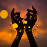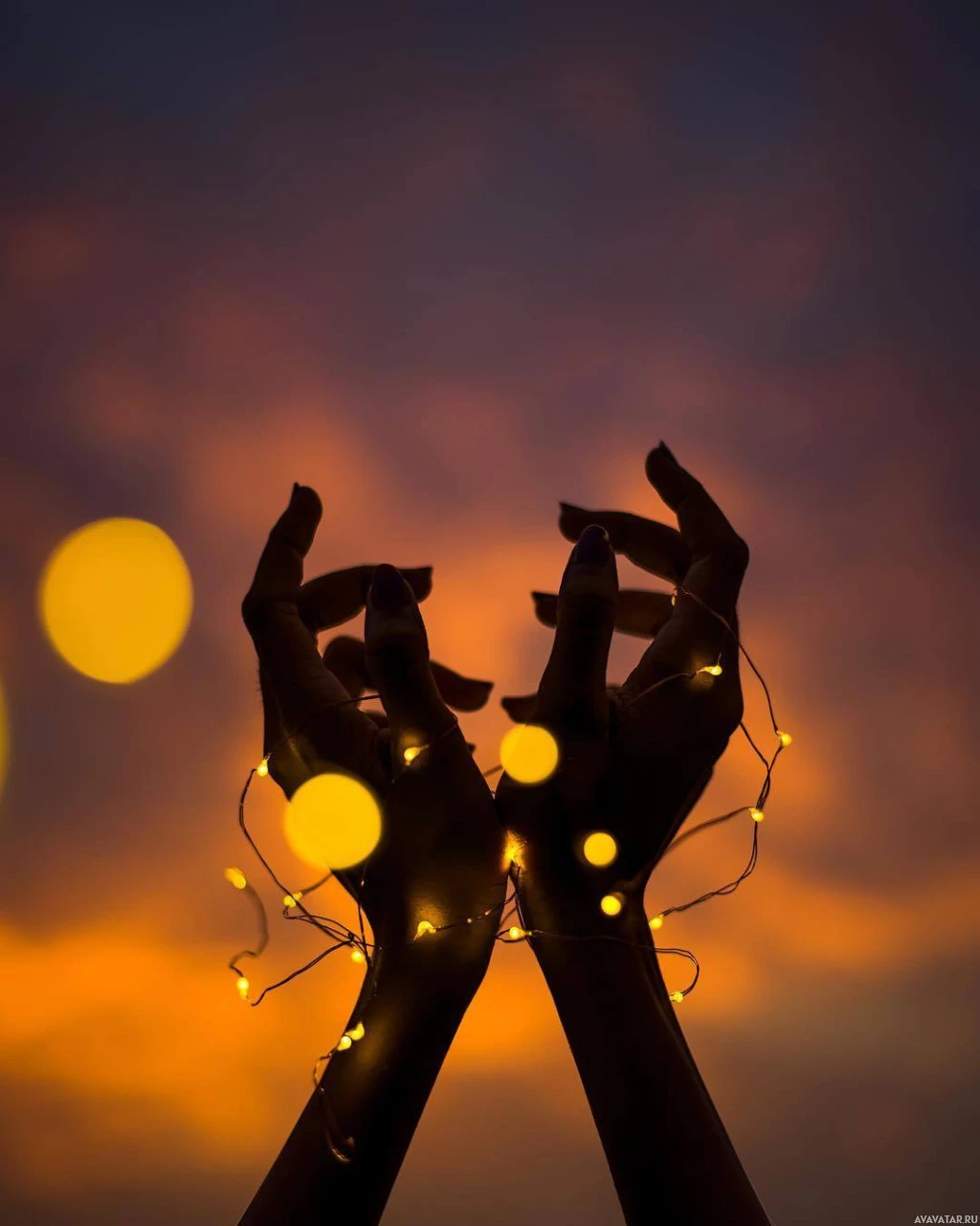 warm tones that suggest either a sunset or artificial lighting designed to mimic such effects. There are also circular objects in the air above the hands, which could be part of the light decoration or simply glowing lights that create an illusion of