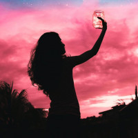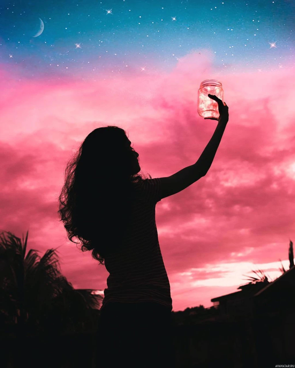 shades of pink and purple with clouds scattered across it. A woman is reaching out towards an object that looks like a jar or
