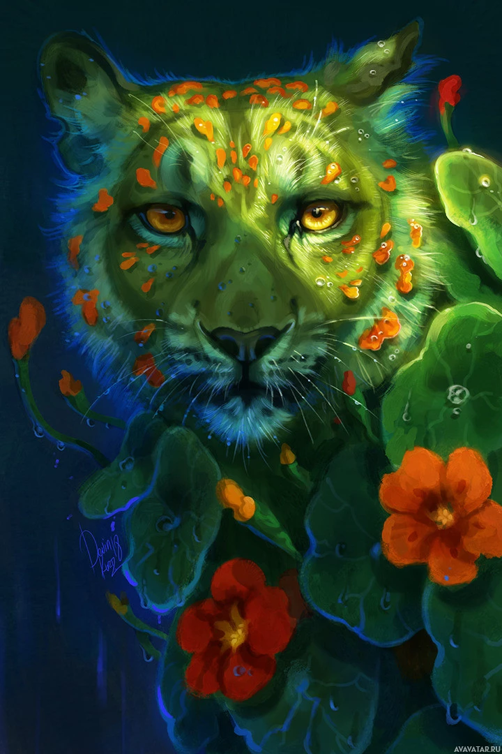 vibrant colors, featuring the tiger surrounded by lush greenery and flowers that seem to be blooming in time-lapse fashion, adding a dynamic element to the scene. The tiger's eyes are open wide, and it appears alert, which could suggest curiosity or attentiveness towards its surroundings. The background is dark, which contrasts with