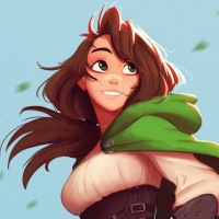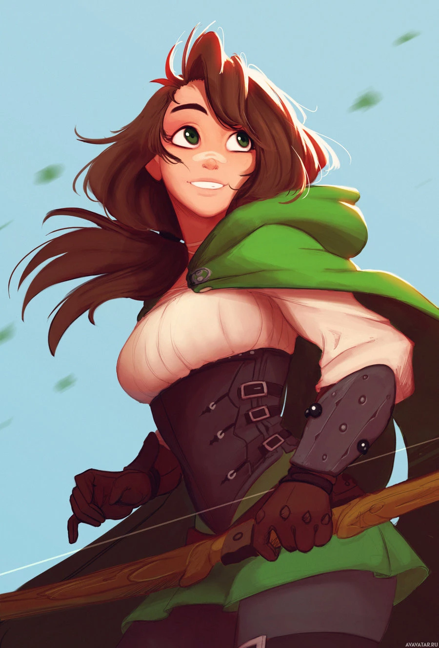a young girl with brown hair, wearing a green and white fantasy-themed outfit that includes a cloak, armor pieces, and a quiver full of arrows. She is holding a bow and seems ready for action or adventure. Her expression is one of readiness or determination. The background suggests