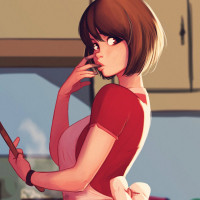 a red shirt, blue shorts, and what appears to be an apron, suggesting she might be engaged in cooking or baking activities. The art style is reminiscent of Japanese manga, known for its