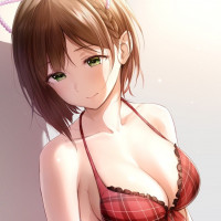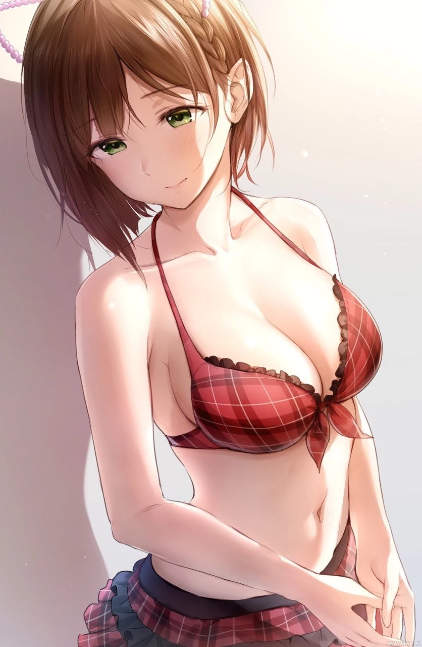 The image features an animated character, a girl with short brown hair and green eyes. She is wearing a bikini top and what appears to be a plaid skirt or mini-skirt. The girl has a cheerful expression on her face and seems to be in a relaxed pose.