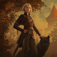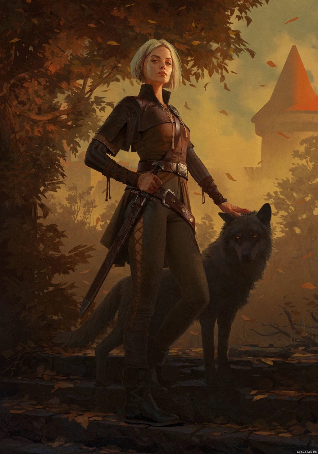 The image shows a girl, possibly blonde, with a wolf. She is wearing a fantasy-style outfit that includes elements like armor and boots. The setting appears to be autumn or misty, as suggested by