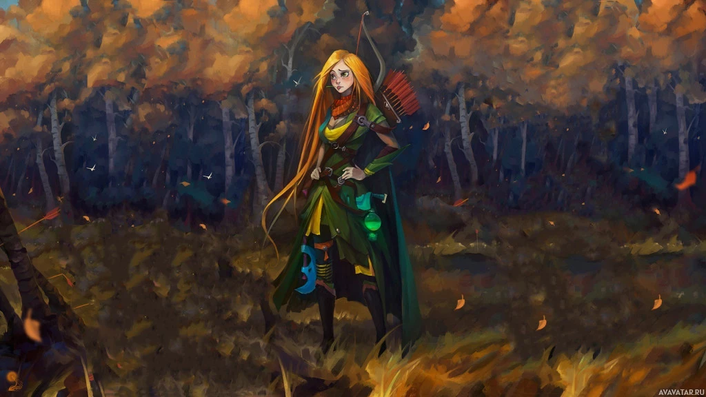 The image depicts a character from the game Dota 2, known as Windranger. She is standing amidst an autumnal forest with trees and