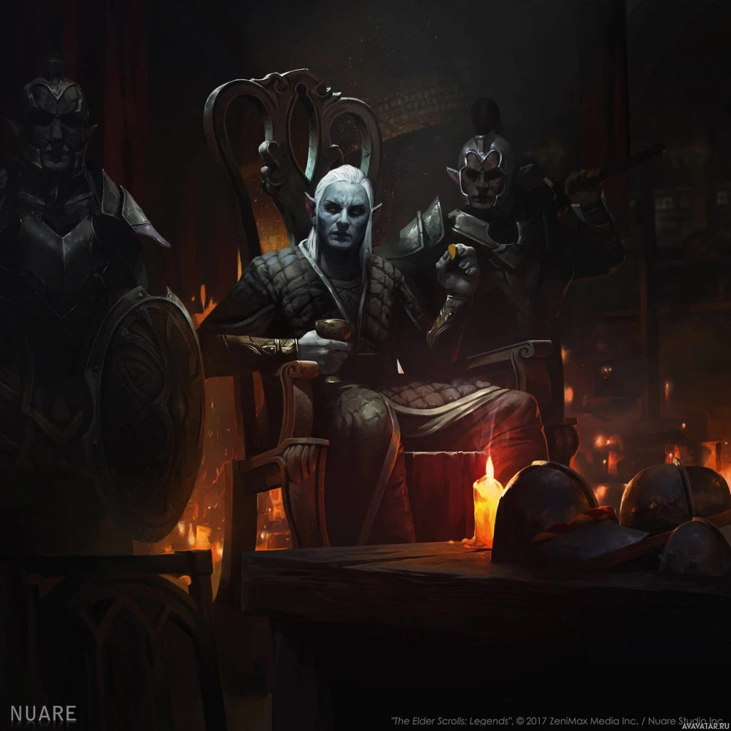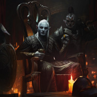the fantasy universe. They are dressed in armor and wielding weapons, suggesting they might be warriors or heroes. One of the characters is seated on a throne-like chair and holding what appears to be a cup, while the others stand behind him. The setting looks like it could be a tavern or hall, given