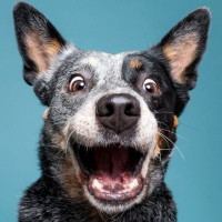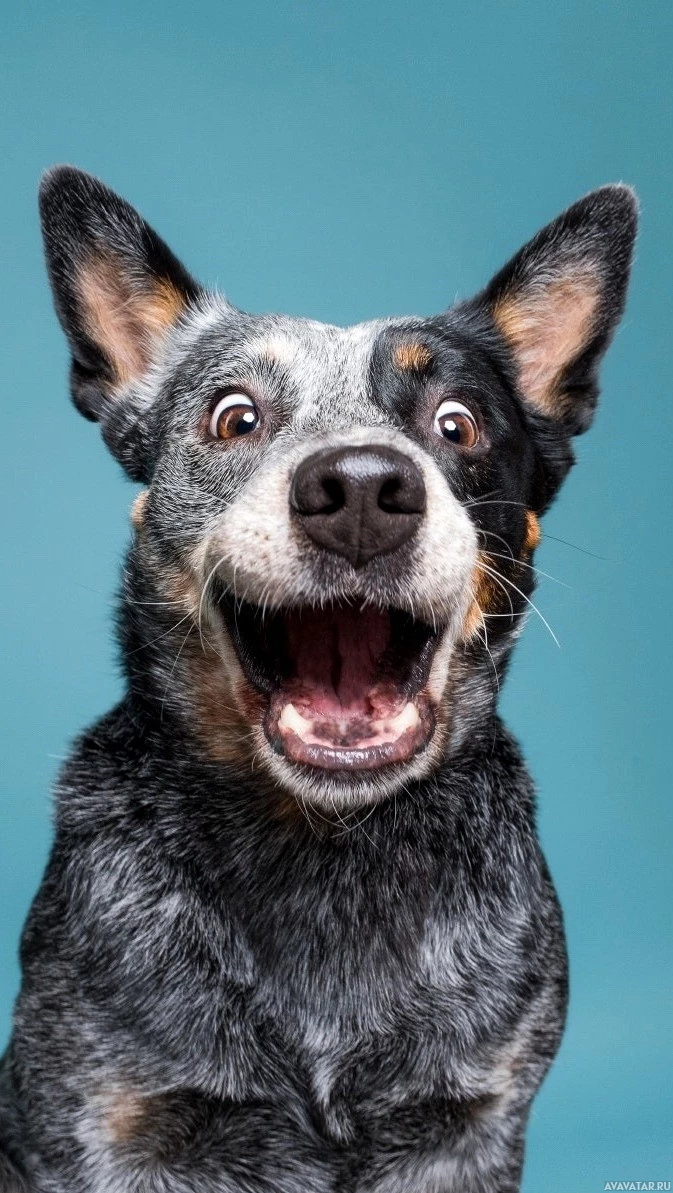 color pattern—a mix of blue and tan—and its alert, expressive face. In the picture, the dog has a surprised or excited expression, with its mouth wide open in mid-bark. The background is plain, which puts the focus on the dog's