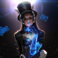 a top hat and has a visor that covers her eyes, which suggests she might be a playable hero from the game "Overwatch." She appears to be in a setting that could be a futuristic arena, given the presence of what looks like electronic or technological equipment around her. The character is also holding an object that emits