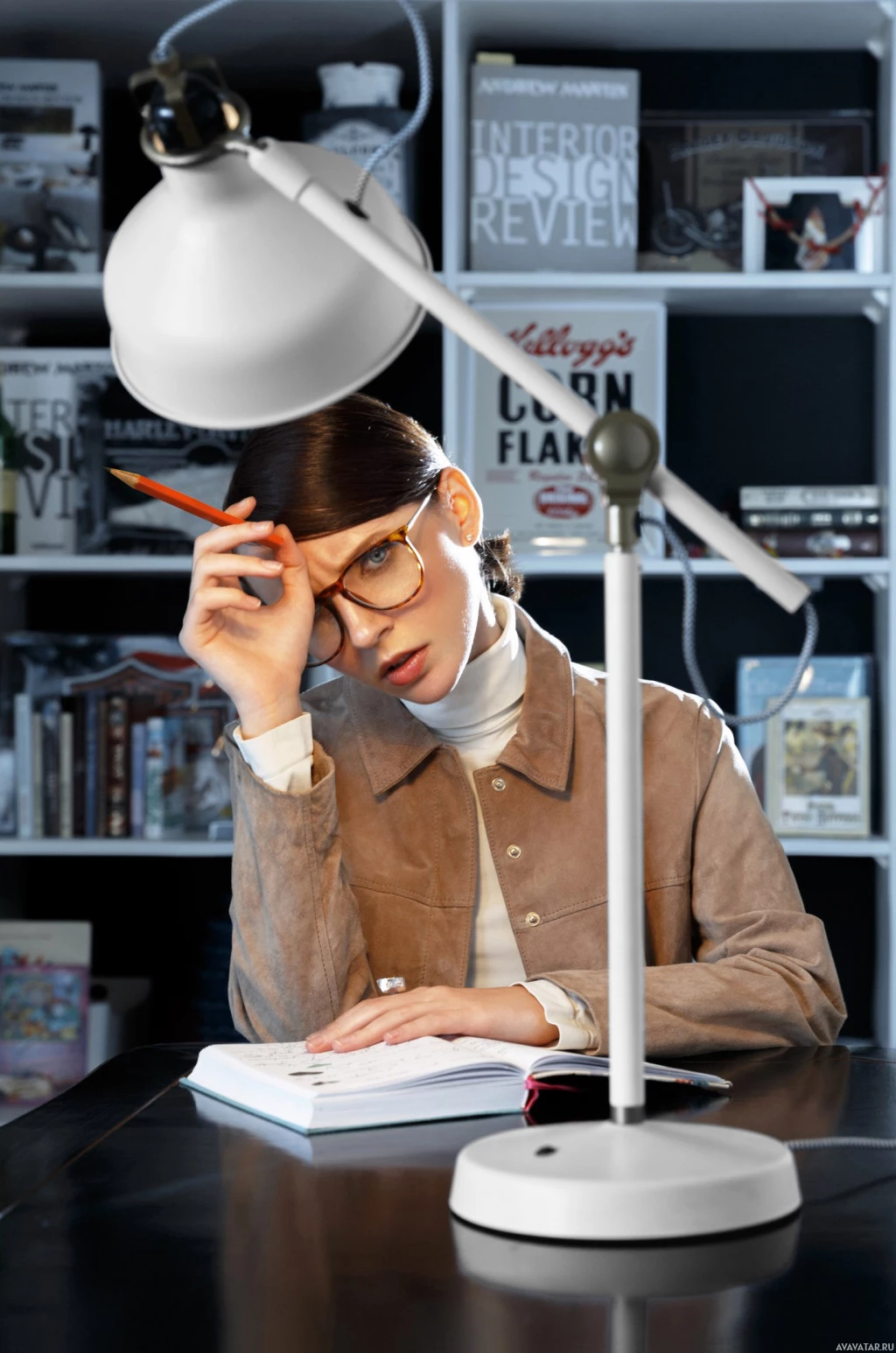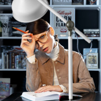 brunette hair and is wearing glasses. The setting looks like a study or workspace environment, indicated by the presence of books and what seems to be