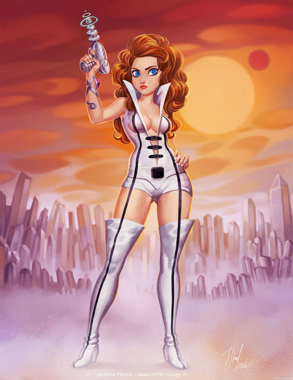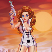 red hair and is dressed in a futuristic or superhero costume that includes elements such as a cape, gloves, boots, and what appears to be a utility belt. The character is holding a gadget or weapon in her right hand, which seems to be emitting