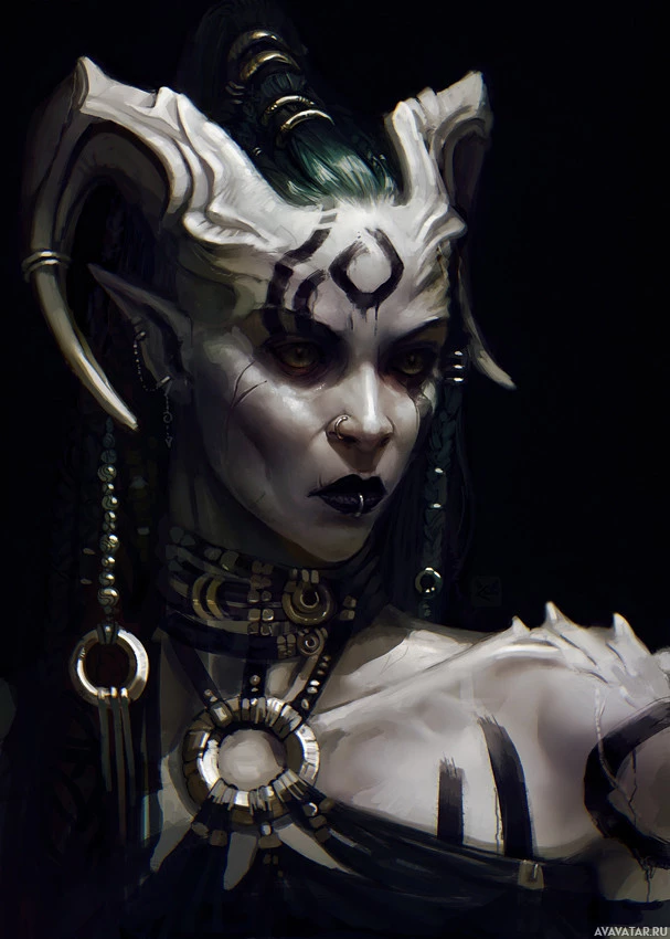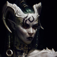dark skin, pale eyes, and an expression that conveys intensity or seriousness. The background is neutral and does not distract from the subject of the image, which is clearly a fantasy or demonic representation.