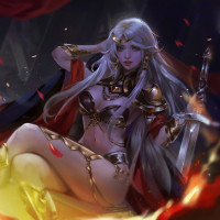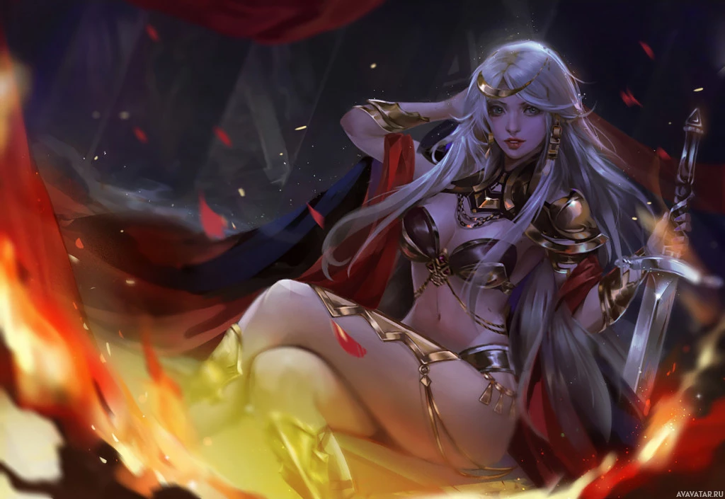 golden accents and carrying a sword. Her pose suggests confidence and readiness for battle. There are also visual elements such as flames and what appears to be a magical or mystical energy surrounding her. The artwork showcases a fantasy theme, possibly related to gaming or comic
