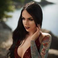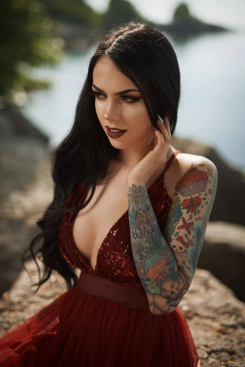 a red dress that seems to be sleeveless or have short sleeves. Her pose suggests she is posing for the photo, possibly in