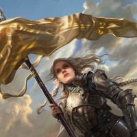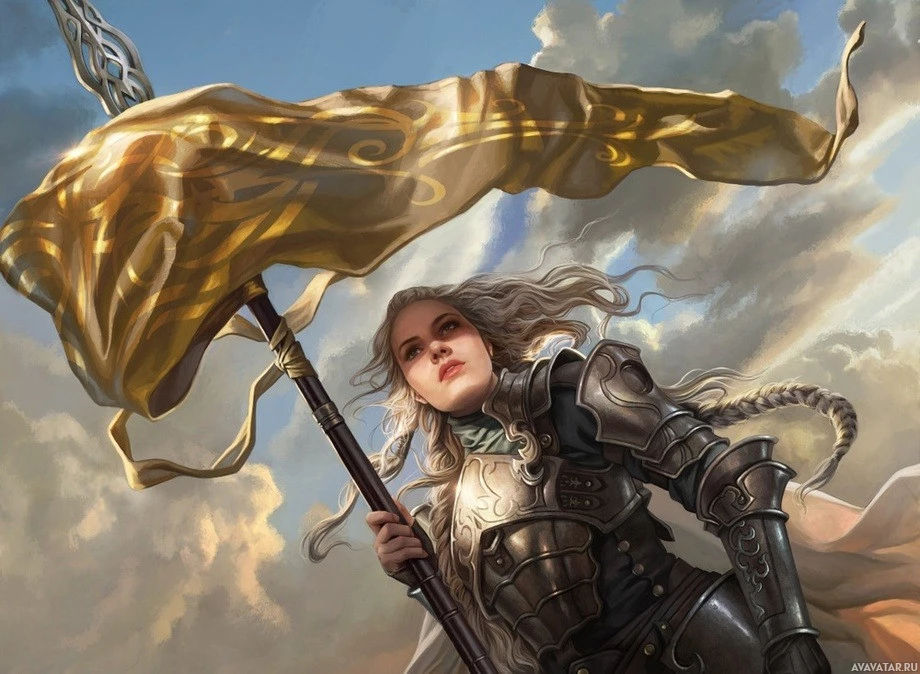 blonde hair and is holding a flag aloft while standing on what seems to be a battlefield or war zone, given the presence of clouds and a sky that suggests conflict. She is wearing armor and holds a weapon in her other hand, emphasizing her role as a fighter. The character could also be described as a "girl" based on the context provided.