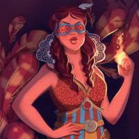 the Witcher series, where different races coexist and have unique cultural practices. The background features elements such as leaves and what appears to be a flame, which could symbolize her connection to nature or