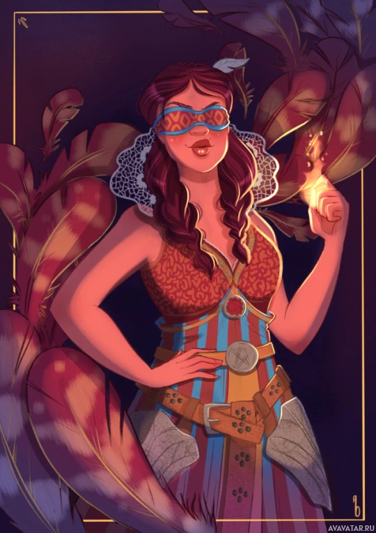 the magical aura and the bracelet on her wrist, which typically symbolizes magical power in fantasy settings. She's wearing an outfit that suggests she might be from a non-human race or has some sort of connection to the world of