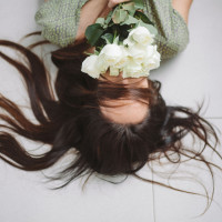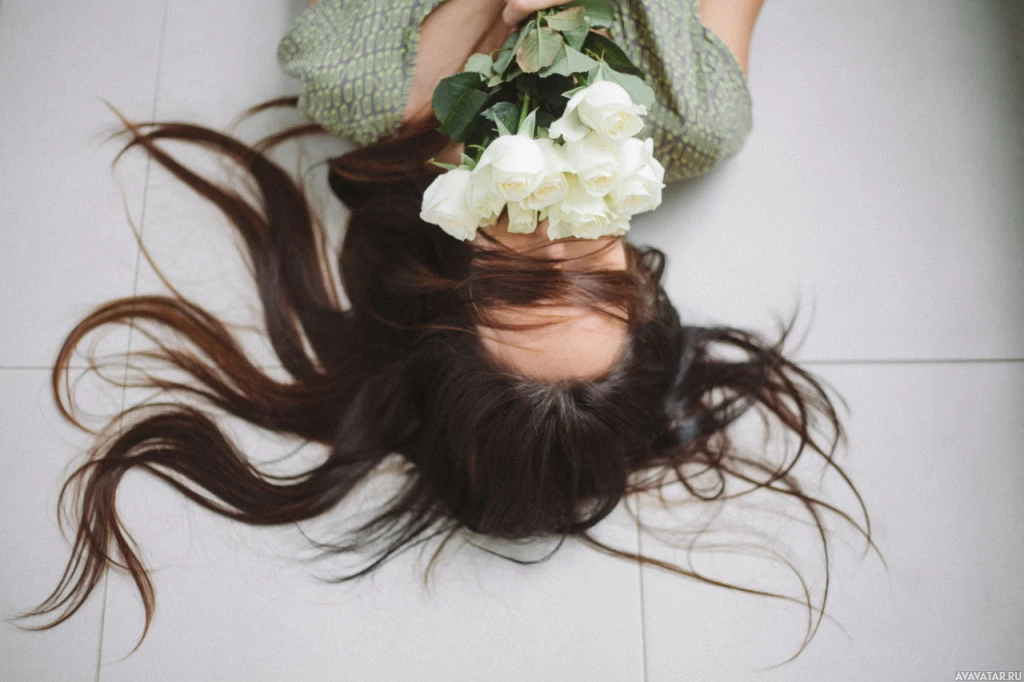 The image shows a person lying on their back with their hair spread out around them. They are holding a bouquet of