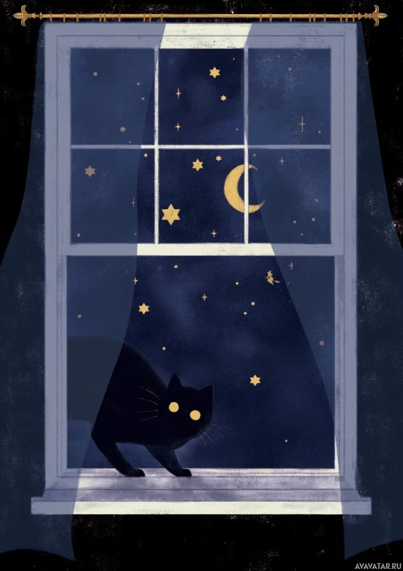 На снимке изображена черная кошка, сидящая ночью у открытого окна. За окном можно увидеть звездное небо с полумесяцем и созвездиями, предполагая, что это поздний вечер или раннее утро. Занавески отведены в сторону, что позволяет увидеть ночь снаружи.