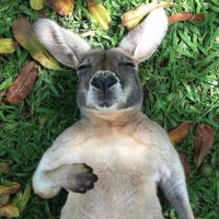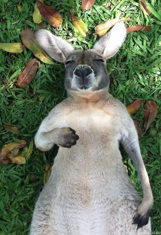back in the grass, with its belly exposed and its arms positioned upwards. It appears to be relaxing or possibly even sleeping. There are leaves scattered around, which suggests this photo might have been taken during autumn when