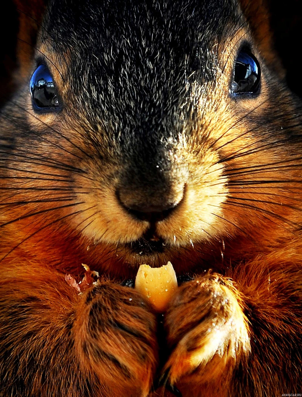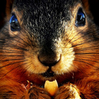 dark eyes and its fur appears to be brownish with some black markings, typical of the coloration of many squirrel species. It looks like it is holding a small