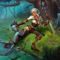 the fantastical atmosphere of the scene. The image is rich in detail and captures a moment that seems to be from the game's narrative, featuring Ciri, the protagonist, interacting with one of her companions.