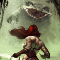 a humanoid figure, which adds to the fantastical nature of the scene. The setting seems to be a jungle or swamp environment, with mossy trees and a greenish atmosphere, contributing to