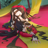 blonde hair and is dressed in an elaborate black and red costume with a cape. They are sitting on what appears to be a stage or performance area, as suggested by