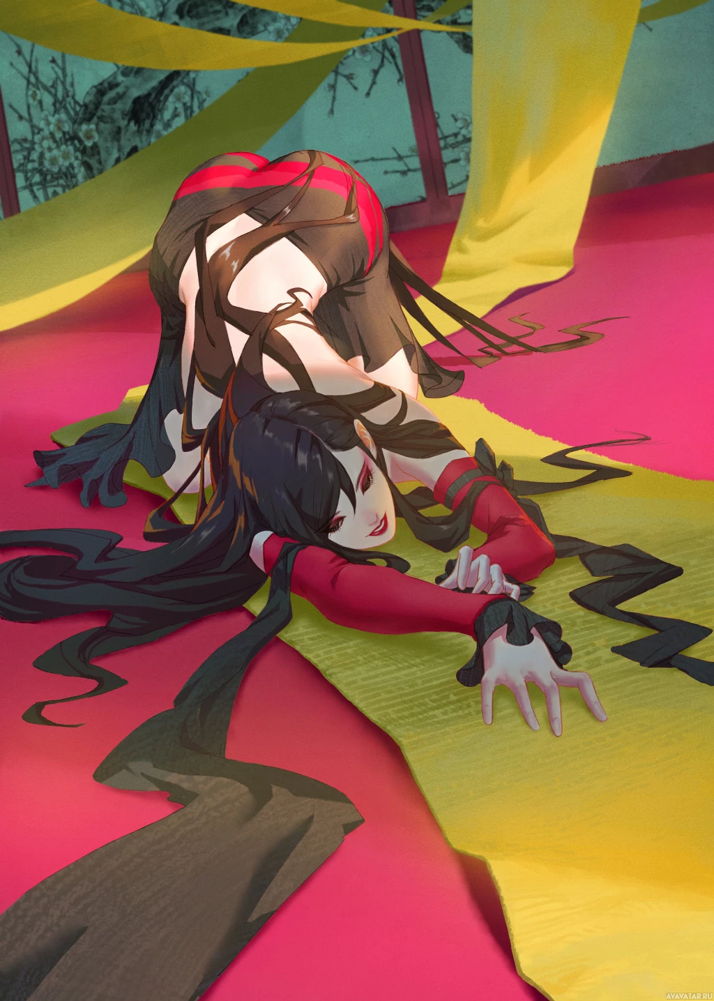 animated characters. One character has dark hair and is wearing a red outfit, while the other character has