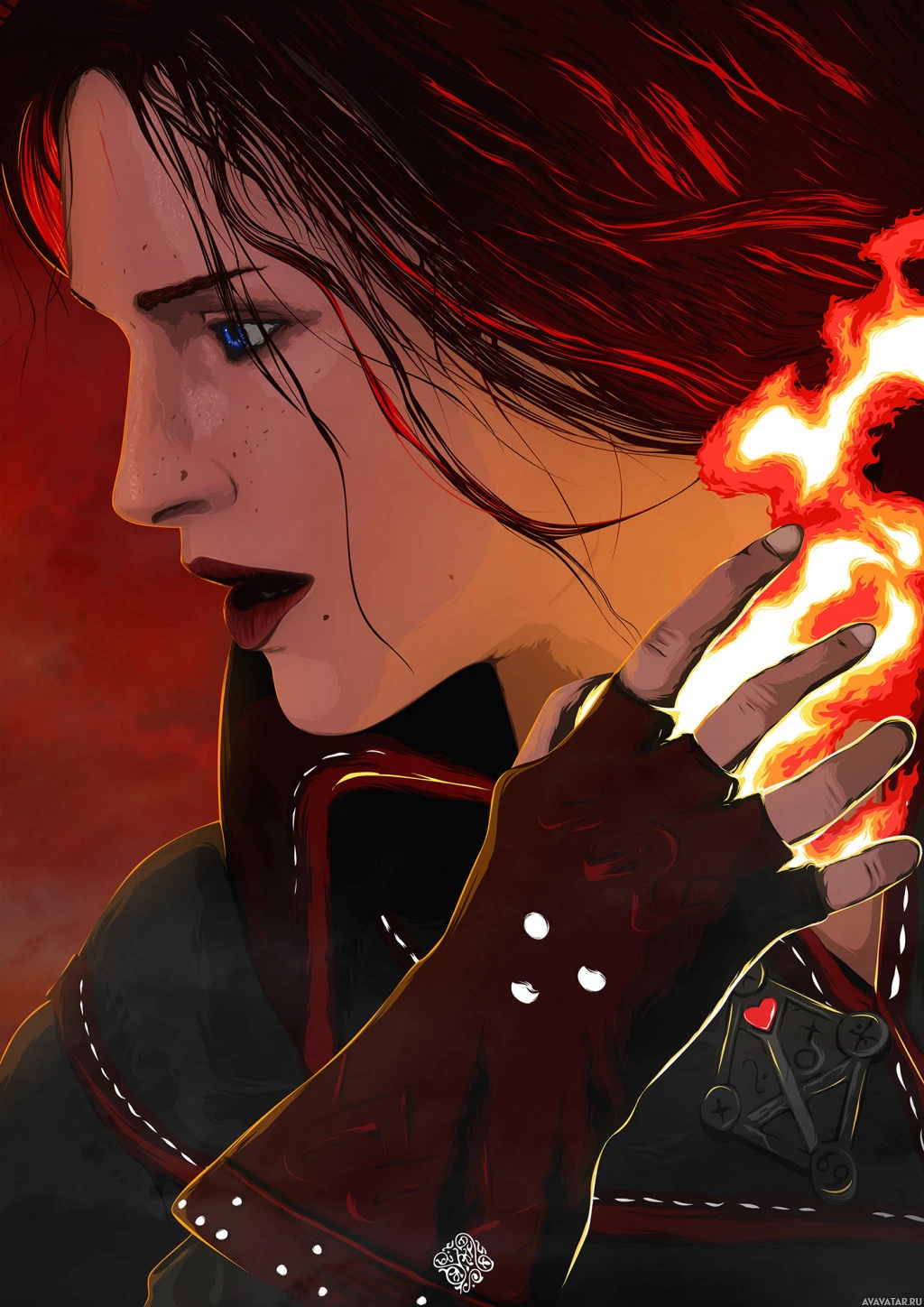 a contemplative expression on her face, wearing dark clothing with a red accent that matches the fiery element around her neck, which suggests she might be using magic or has just cast a spell. The background is dimly lit, giving the impression of an intense and mysterious atmosphere.