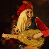 medieval settings such as taverns, where the character might perform. The setting appears to be a dimly lit indoor space, possibly a stage or a themed event, contributing to