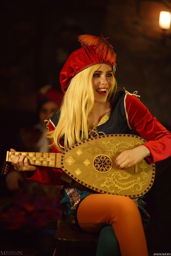the video game "The Witcher 3: Wild Hunt." The individual is wearing a red and green outfit that could be representative of Priscilla or a similar character. They are holding an instrument, likely a lute or harp, which is often associated with music and entertainment in