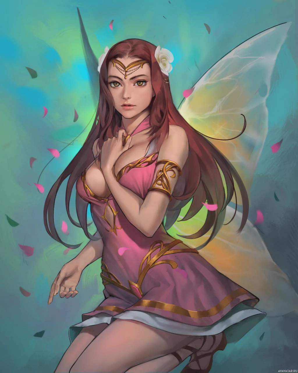 red hair and is wearing a pink outfit with gold accents, which suggests a princess or fairy-like attire. She also has wings, indicating her role as a fairy or