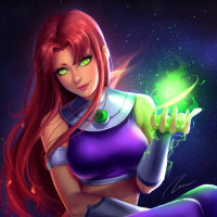 an illustrated character, a female with red hair and green eyes. She is depicted in a fantasy style, sitting amidst what appears to be a magical or mystical environment, given the presence of a glowing
