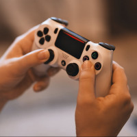 human hands holding a game controller, which appears to be a PlayStation DualShock controller based on its design. The controller is being used with both hands, one hand on the direction pad and the other on the trigger buttons, indicating that the person is actively playing