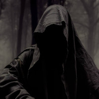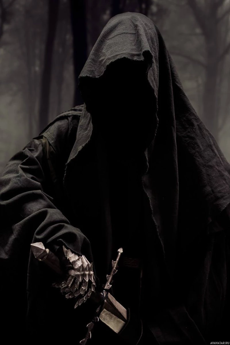 Lord of the Rings." This character is often referred to as a Nazgul or Ringwraith. The person is wearing dark robes and a hood that obscures their face, adding