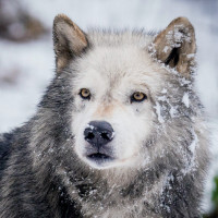 The image shows a gray wolf with white markings around its eyes and muzzle. It appears to be standing in the snow, which suggests it might be in a colder climate or during winter. The wolf has a focused gaze and seems to be looking directly at the camera.