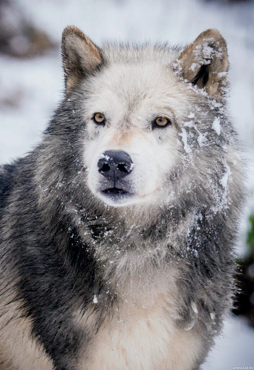 На картинке изображен серый волк с белыми отметинами вокруг глаз и морды. Похоже, что он стоит в снегу, что говорит о том, что он может быть в более холодном климате или зимой. У волка сосредоточенный взгляд и, кажется, он смотрит прямо в камеру.