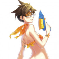an animated character dressed in a bikini and holding what appears to be a gun with one hand, while the other arm is bent at the elbow. She has